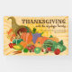 Celebrate Thanksgiving with this design featuring a cornucopia or horn of plenty filled with all your favorite fall vegetables, grain and fruit: mountain ash berries, wheat, pumpkin, bell pepper, corn, carrot, potato, apple, grapes, fig, artichoke, watermelon, strawberry, kiwi, tomato and cabbage. On top is an autumn arrangement featuring acorn, chestnut, berries and assorted fall foliage. Replace the sample text with your own for a personalized design.