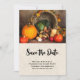 Save the date card with a photograph of a thanksgiving harvest, set on a rustic wooden table. Pumpkin, potatoes, squash etc... make up this bountiful collection of food. Colorful autumn leaves surround the cornucopia basket.