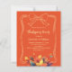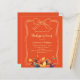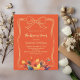 A pumpkin orange colored background. Decorated with fall leaves and a hand-drawn bow. Personalize and add the party details.
