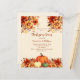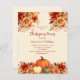 A soft beige background. Decorated with pumpkins and orange and yellow flowers. Personalize and add the party details.