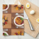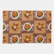 This delightful Thanksgiving pattern features a repeating grid of holiday motifs. The squares alternate between two central images: a perfectly roasted turkey dinner served on a plate with cranberries and green beans, and a festive table centerpiece with a glowing candle and a decorative wreath of autumn leaves and berries. The rich, earthy brown and orange tones and subtle linen texture create a warm and inviting atmosphere, perfect for celebrating the harvest season.