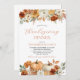 Thanksgiving dinner invitation with pumpkins, greenery and fall leaves.