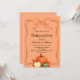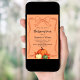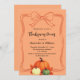 An atomic tangerine colored background. Decorated with pumpkins, and a hand-drawn bow. Personalize and add the party details.