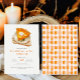 Invite your loved ones to a cozy and festive Thanksgiving dinner with these charming invitations. The design features a cute illustration of a slice of pumpkin pie topped with whipped cream, set on a warm orange gingham napkin, evoking the comforting flavors of the season. The editable text "Thanksgiving Dinner" is elegantly highlighted in a classic serif font in vibrant orange, creating an inviting and festive feel. The details of the event are clearly displayed below, ensuring guests have all the information they need to join the celebration. The back of the invitation features an orange watercolor gingham plaid pattern. Perfect for adding a touch of warmth and charm to your holiday gathering, these invitations beautifully capture the spirit of Thanksgiving, making your dinner feel even more special and welcoming.