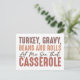 This fun and festive Thanksgiving design features the playful phrase "Turkey, Gravy, Beans and Rolls, Let Me See That Casserole" in a bold, eye-catching layout. The text is arranged in a mix of blocky, distressed fonts and elegant script, creating a dynamic and engaging visual effect. The color palette includes warm, earthy tones like browns, oranges, and reds, perfectly reflecting the cozy and comforting atmosphere of a Thanksgiving feast. The distressed texture of the text adds a rustic, vintage feel to the design, making it ideal for the holiday.