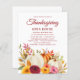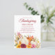Thanksgiving dinner open-house invitation on budget paper. Cheerful fall flowers and autumn leaves with boho watercolor pumpkins and script text in festive colors. Click Customize to change the text, colors, or background.