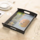 This is a well made, sturdy wooden tray with a flawless black finish and lovely map on the tray surface. It is both vintage & modern at the same time. Looks exactly like the photo; does not disappoint. So nice to find something of quality individually made and not the mass-produced 'shabby chic' merchandise seen in stores. I am so pleased to be able to give this to my college-age niece for her birthday. This can be used as a tray to hold jewelry or toiletries, or hung on the wall as art. The map surface is sealed (it is slightly shiny) so would be moisture resistant. It is well worth the asking price but I was able to apply a sale code as well. Very happy with my purchase. Map is crisp & clear and sealed with a water-resitant finish.