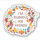 This vibrant Thanksgiving-themed image features Mickey Mouse and Minnie Mouse surrounded by a beautiful wreath of autumn leaves, festive pies, and a cooked turkey, expressing the sentiment "I'm Thankful For Friends." The design captures the essence of gratitude and friendship, perfect for celebrating the season of giving thanks.