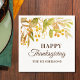These Thanksgiving napkins are decorated with watercolor autumn leaves in fall colors and stylish brown script typography.