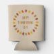 This awesome can cooler features a digital art image of a series of Oak leaves in shades of red, orange, yellow and green arranged in a circle around some text with alternating letters of red, yellow, orange and green that says Happy Thanksgiving Day.