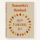 This awesome notebook features a digital art image of a series of Oak leaves in shades of red, orange, yellow and green arranged in a circle around some text with alternating letters of red, yellow, orange and green that says Happy Thanksgiving Day. There is custom text so you can personalize this notebook.