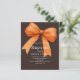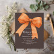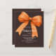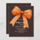 A bistre, dark brown colored background. Decorated with a larage orange bow. Personalize and add the party details.