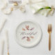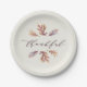 Created to coordinate with Lea Delaveris Design's "Give Thanks" collection, this Thanksgiving plate features festive colorful falling leaves along with the word "thankful" in modern calligraphy. The colors are seasonal shades of deep plums and purples and burnt oranges on an off-white background. Also works well for a fall baby or wedding shower, office potluck, friendsgiving or a rehearsal dinner.