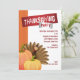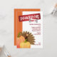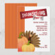 A cute Thanksgiving invitation featuring a festive orange and gold stripe background, pumpkins and a turkey. (FP)