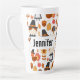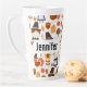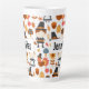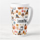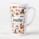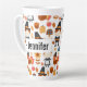 A latte mug with a seasonal Thanksgiving pattern. Featuring whimsical pilgrims, turkeys, pumpkin pie and other various autumn themed elements.