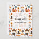 Flat thank You card with a seasonal Thanksgiving pattern. Featuring whimsical pilgrims, turkeys, pumpkin pie and other various autumn themed elements.