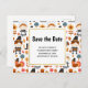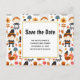 Save the date postcard with a seasonal Thanksgiving pattern. Featuring whimsical pilgrims, turkeys, pumpkin pie and other various autumn themed elements.