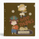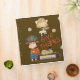 This chocolate brown recipe binder has milk chocolate polka dots to decorate the background. There is a little boy dressed as an Indian chief and holding a pumpkin along with a little girl dressed as a pilgrim and holding a steaming hot pie. A sleepy puppy lays at their feet. Customizable text to personalize this binder on both the spine and the front of the binder. Ideal for Thanksgiving recipes or even as a family photo album!