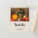 Thank you postcard with a photograph of a thanksgiving harvest, set on a rustic wooden table. Pumpkin, potatoes, squash etc... make up this bountiful collection of food. Colorful autumn leaves surround the cornucopia basket.