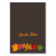 Seat family and guests at the dinner table with tented place cards for Thanksgiving (or any fall event). Dark brown cards with a name template that will show on one side when folded (after purchase). Beneath the name, in bold script, of the guest is a row of pretty fall leaves in gold, red, orange and green.