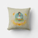 A pillow with a cute thanksgiving design. A funny looking turkey, wearing a pilgrim hat and sitting down with his legs splayed out, eating some pumpkin pie. He has a goofy look on his face too. Holding a knife and fork and ready to dive in to this delicious dessert.