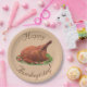 Design features the image of a baked turkey as center design. The words "Happy Thanksgiving!" are displayed as an arch above and below image in brown lettering. Background is a light shade of tan. All text is customizable.