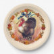 Set of paper plates, each with a vintage Thanksgiving image of a Turkey, wishbone, and autumn leaves border.