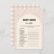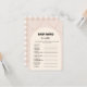 minimalist, scramble word card for baby shower The words on this card are all related to babies and have been scrambled. The guests will compete to see who can unscramble them all first! ANSWER KEY: 1. car seat; 2. milk 3. playpen 4. pacifier The fifth item is a diaper rocking chair. 7. nursery 8. baby monitor; 9. swaddle 10. formula. 11. rubber ducky 12. stroller. 13. monitor. 14. teether. 15. Thermometer.