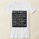 My overall review is that the T-shirt is nice, it fits true to size however the font is significantly smaller than advertised and you can't read it. The printing is unreadable and there is a strain to read it. It does not look like the advertised product. Maybe the shirt color is darker or a larger more visible font should have been used. Photos with and without flash and font is barely legible.