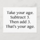 Take your age. Substract 3. Then Add 3. That's your age.