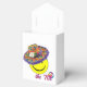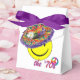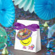 White tent-style with purple ribbon favor box with an image, on the front and back, of a sunny yellow happy face, a 70s icon to be sure, wearing a colorful 70s Disco hat. See the entire Disco 70s Favor Box collection in the PARTY FAVORS section.
