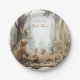 Create a storybook setting for your baby shower feast with these charming paper plates. Each plate is a canvas showcasing a serene woodland scene, where a friendly bear, a clever fox, a watchful owl, and other adorable creatures gather in a sunlit forest clearing, celebrating the soon-to-be arrival of a new little one. The dreamy color scheme features shades of leafy green, acorn brown, daisy white, and sky blue, evoking the tranquil beauty of a forest at dawn. Above the enchanting tableau, Baby Shower is inscribed in elegant lettering, making these plates perfect for serving sweet treats or savory snacks while doubling as memorable keepsakes from this special day.