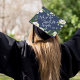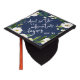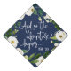 Beautiful grad cap topper features the quote "And so the adventure begins" in white script lettering on a navy blue background adorned with white watercolor flowers and green foliage. Personalize with your class year and/or school.