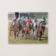 Horse racing's greatest moment when thoroughbreds turn into the top of the stretch on the turf. This head view of a dozen racehorses, with their rippling muscles battle to the finish line in a photo finish noses apart at historic Parx Racing and Casino for the running of the annual Alphabet Soup stakes on the grass. Javier Castellano on the rail, with the yellow cap and royal blue silks, goes wire to wire with Firsthand Report, the only filly in the race.