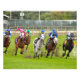A full field of nine horses turning for home at the top of the stretch on the turf at Parx racing and casino. Racing's greatest moment when the thoroughbreds turn into the stretch for the final drive towards the finish line. Leading the way, the white gray "Fast and Accurate leads the charge with jockey Jose Ortiz jr in the irons. Green grass, blue skies and white thoroughbreds at historic Parx for the running of the Alphabet Soup stakes.