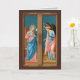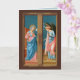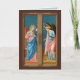 “℣. The Angel of the Lord declared unto Mary, ℟. And she conceived of the Holy Spirit.” Thus, begins the Angelus the Church’s thrice-daily prayer to the Blessed Virgin Mary (BVM) that commemorates the Incarnation at the Annunciation. + The Annunciation was an immensely popular subject in the art of the Middle Ages and the Renaissance. As a two-person composition, the subject lent itself to use on the outer leaves of triptychs: the angel on one leaf; Mary, on the other. A triptych is an artwork—most often a panel painting—that is comprised of three parts hinged together in such a way that it can be displayed open or folded shut. + Here, Filippo Lippi (1406-1469) has painted the Annunciation in tempera on wood in warm pinks, salmons, and reds and in both brilliant and dark blues. Both figures stand in their narrow respective spaces, the Archangel Gabriel bowing slightly to the gentle and sweetly featured Maiden Mary. + Saints_Aplenty likes a dark brown background for this image. A dark brown background gives viewers the impression that they are onlookers observing the scene through a window. But, as per usual, we have provided a Color Palette postcard for other suggested hues. + Feast of the Annunciation: March 25; Feast of St. Gabriel the Archangel: September 29 + Image Credit (M 038): Antique image of The Annunciation by Filippo Lippi (1406-1469) from a late 19th-early 20th-century postcard in chromolithography, originally published by E. Sborgi, Florence, Italy, from the designer’s private collection of religious ephemera. The original panels from a polyptych of unknown origin are in the Filippo and Filippino Room of the Uffizi Gallery in Florence. The Annunciation forms the upper halves of the two leaves while SS. Anthony Abbott and John the Baptist appear on the lower left and lower right, respectively.