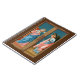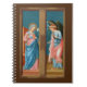 “℣. The Angel of the Lord declared unto Mary, ℟. And she conceived of the Holy Spirit.” Thus, begins the Angelus the Church’s thrice-daily prayer to the Blessed Virgin Mary (BVM) that commemorates the Incarnation at the Annunciation. + The Annunciation was an immensely popular subject in the art of the Middle Ages and the Renaissance. As a two-person composition, the subject lent itself to use on the outer leaves of triptychs: the angel on one leaf; Mary, on the other. A triptych is an artwork—most often a panel painting—that is comprised of three parts hinged together in such a way that it can be displayed open or folded shut. + Here, Filippo Lippi (1406-1469) has painted the Annunciation in tempera on wood in warm pinks, salmons, and reds and in both brilliant and dark blues. Both figures stand in their narrow respective spaces, the Archangel Gabriel bowing slightly to the gentle and sweetly featured Maiden Mary. + Saints_Aplenty likes a dark brown background for this image. A dark brown background gives viewers the impression that they are onlookers observing the scene through a window. But, as per usual, we have provided a Color Palette postcard for other suggested hues. + Feast of the Annunciation: March 25; Feast of St. Gabriel the Archangel: September 29 + Image Credit (M 038): Antique image of The Annunciation by Filippo Lippi (1406-1469) from a late 19th-early 20th-century postcard in chromolithography, originally published by E. Sborgi, Florence, Italy, from the designer’s private collection of religious ephemera. The original panels from a polyptych of unknown origin are in the Filippo and Filippino Room of the Uffizi Gallery in Florence. The Annunciation forms the upper halves of the two leaves while SS. Anthony Abbott and John the Baptist appear on the lower left and lower right, respectively.