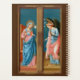 “℣. The Angel of the Lord declared unto Mary, ℟. And she conceived of the Holy Spirit.” Thus, begins the Angelus the Church’s thrice-daily prayer to the Blessed Virgin Mary (BVM) that commemorates the Incarnation at the Annunciation. + The Annunciation was an immensely popular subject in the art of the Middle Ages and the Renaissance. As a two-person composition, the subject lent itself to use on the outer leaves of triptychs: the angel on one leaf; Mary, on the other. A triptych is an artwork—most often a panel painting—that is comprised of three parts hinged together in such a way that it can be displayed open or folded shut. + Here, Filippo Lippi (1406-1469) has painted the Annunciation in tempera on wood in warm pinks, salmons, and reds and in both brilliant and dark blues. Both figures stand in their narrow respective spaces, the Archangel Gabriel bowing slightly to the gentle and sweetly featured Maiden Mary. + Saints_Aplenty likes a dark brown background for this image. A dark brown background gives viewers the impression that they are onlookers observing the scene through a window. But, as per usual, we have provided a Color Palette postcard for other suggested hues. + Feast of the Annunciation: March 25; Feast of St. Gabriel the Archangel: September 29 + Image Credit (M 038): Antique image of The Annunciation by Filippo Lippi (1406-1469) from a late 19th-early 20th-century postcard in chromolithography, originally published by E. Sborgi, Florence, Italy, from the designer’s private collection of religious ephemera. The original panels from a polyptych of unknown origin are in the Filippo and Filippino Room of the Uffizi Gallery in Florence. The Annunciation forms the upper halves of the two leaves while SS. Anthony Abbott and John the Baptist appear on the lower left and lower right, respectively.