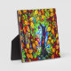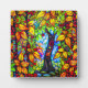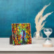 Colorful tabletop art created with AI software features a surreal stained glass apple tree with green and gold leaves, and red apples, that create a frame as well.