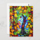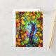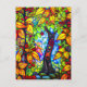 Colorful digital art postcard created with AI software features a surreal stained glass apple tree with green and gold leaves, and red apples, that create a frame as well.