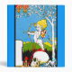 Little blond cupid-like cartoon character with wings and big red shoes cocking his bow while standing on a skull. Illustration by Italian cartoonist Antonio Rubino from the cover of Maggiolata, 1906.