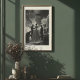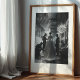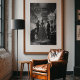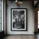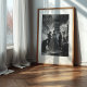 This powerful black and white photograph captures a timeless, behind-the-scenes moment from the golden age of haute couture. From a dramatic low angle, the viewer is drawn into an opulent Parisian salon where a master couturier and his assistant perform a meticulous fitting on a model. She stands with quiet grace in an elegant white gown, a living embodiment of the art being created around her. The scene, illuminated by glittering crystal chandeliers, is a stunning tribute to the dedication, craftsmanship, and enduring glamour of high fashion. This piece is perfect for lovers of classic photography, design history, and sophisticated, statement-making art.