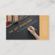 The Art Workshop Yellow Artist Business Card shows an art activity on a black surface with art supplies. It has a clean typography, with a yellow angled business name on center and the business services list on front side. The business name at the back is on a black strip vertical position. Also, the business details are in a yellow background plus the QR code. The entire concept is contemporary and playful makes it exciting for an artist business card.