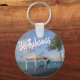 The Bahamas photo keychain to celebrate happy memories of your tropical Caribbean vacation. Photo of a lovely beach scene with a cabana and palm tree, along with The Bahamas in fun typography.