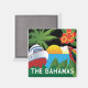 The Bahamas colorful illustration with cruise ship, parrot, palm tree, hibiscus flowers and the name The Bahamas in a vintage deco font. Cruise memories!