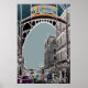 This eyecatching, quirky poster print is a digital painting of the famous Glasgow Barras. Opened in the 1920s the world famous street market is popular with locals and tourists. Located in the east end of the city centre, it was once the largest open air market in Europe. The painting shows the entrance to the market with traders and punters milling below.