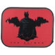 Batman illustration standing in front of bat wing style skyline of Gotham City.