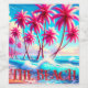 This wine label says "The Beach" on it with a palm tree scene and the ocean pictured on it.