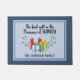 Ring in the holiday season with this customizable doormat that features a simple illustration of festively wrapped Christmas presents adorned with colorful bows and accented with gently falling snow and greenery. Elegant script typography offers a heartfelt holiday message that reads, “The Best Gift is the Presence of Family.” Personalize this design by adding your family name to create a warm greeting for family and guests. Makes a thoughtful gift for new homeowners, too.
