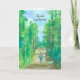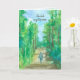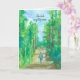 A retirement congratulations greeting card featuring a person hiking on a peaceful road through a forest with a variety of trees under a calm blue sky illustrated with watercolor. On the inside is a faded version of the same image with a congratulations message. You can edit the message to fit your needs.